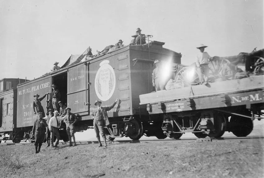 Reed in El Paso, Texas, posing in front of a boxcar apparently owned by the Mutual Film company, which had a contract with Pancho Villa to film footage of his exploits. El Paso Public Library
